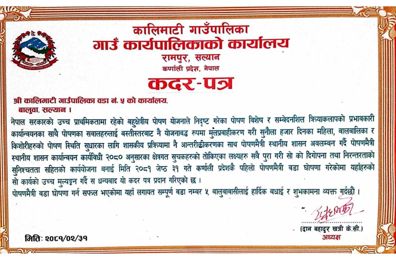 पोषण मेत्री वडा घोषण कदर पत्र प्रदान जि स स सल्यान द्वारा